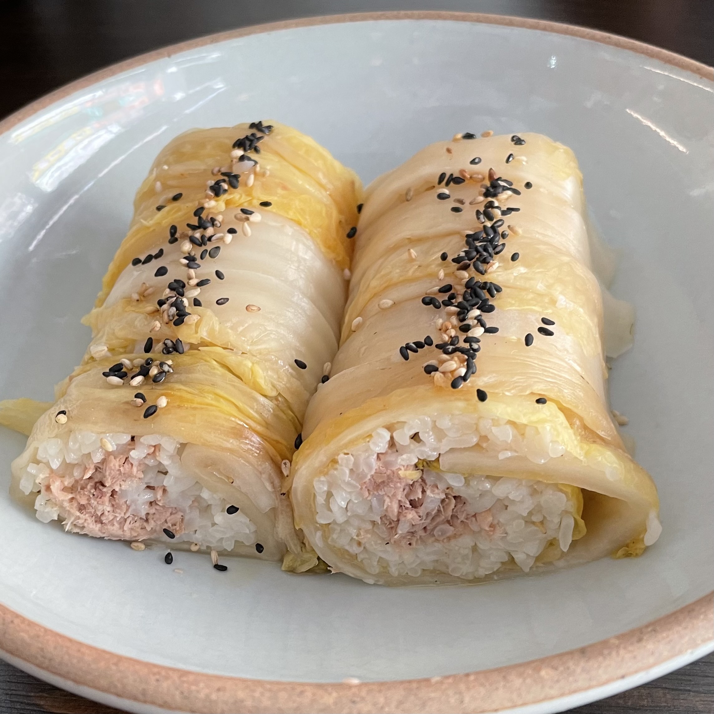 10. 뿌리 쪽부터 김밥 말듯이 주먹밥을 올려 묵은지와 함께 돌돌 말아줍니다.