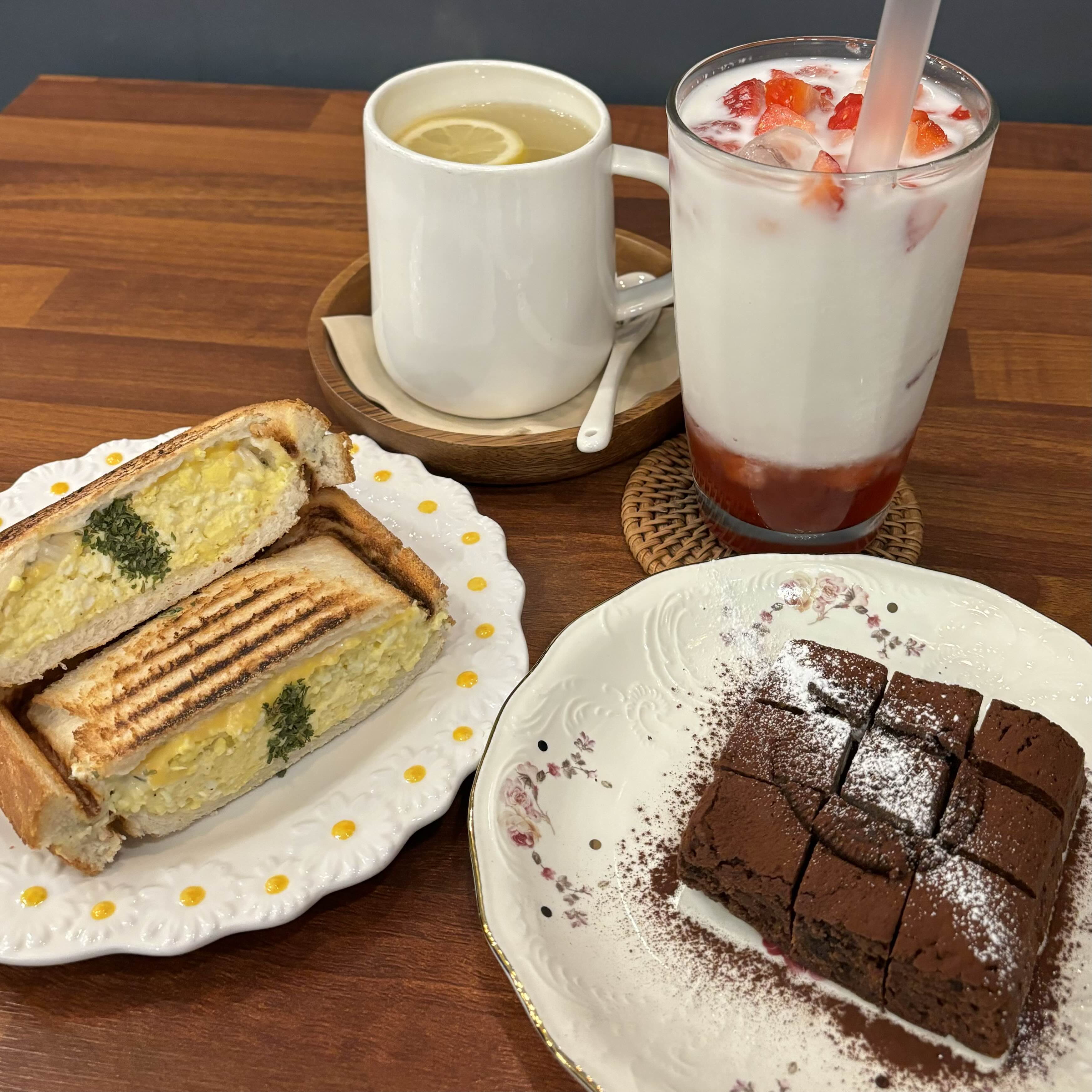 저는 딸기라테를 주문했고, 남자친구는 감기기운이 있어서 유자차를 시켰습니다. 베이커리도 먹고 싶어서 오레오브라우니랑 에그마요 그릴샌드위치도 하나씩 시켰습니다.