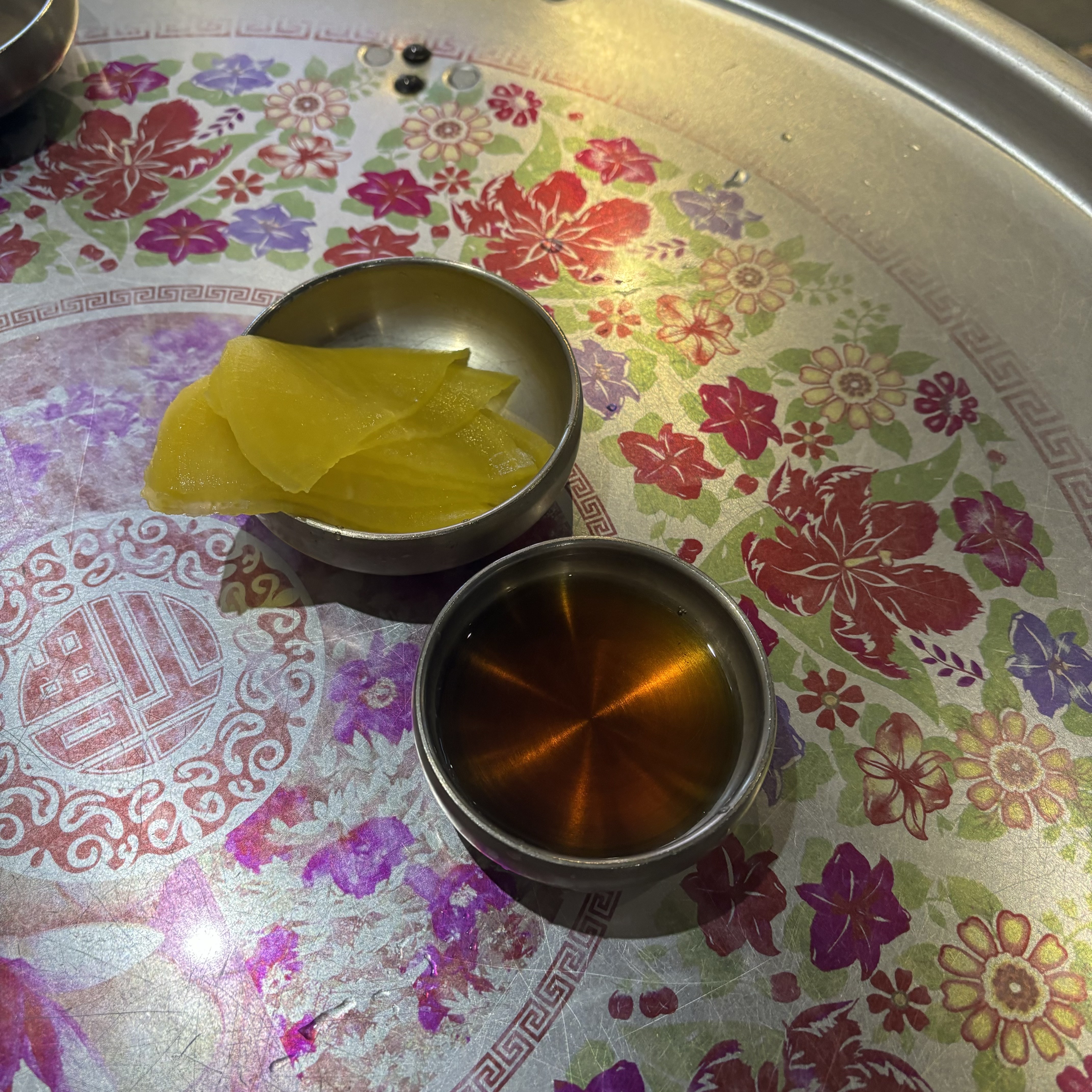 셀프바에서 단무지와 간장소스를 가져왔습니다! 먹을 준비를 하고 있으면 음식이 금방 준비되어 자리로 가져다주십니다.