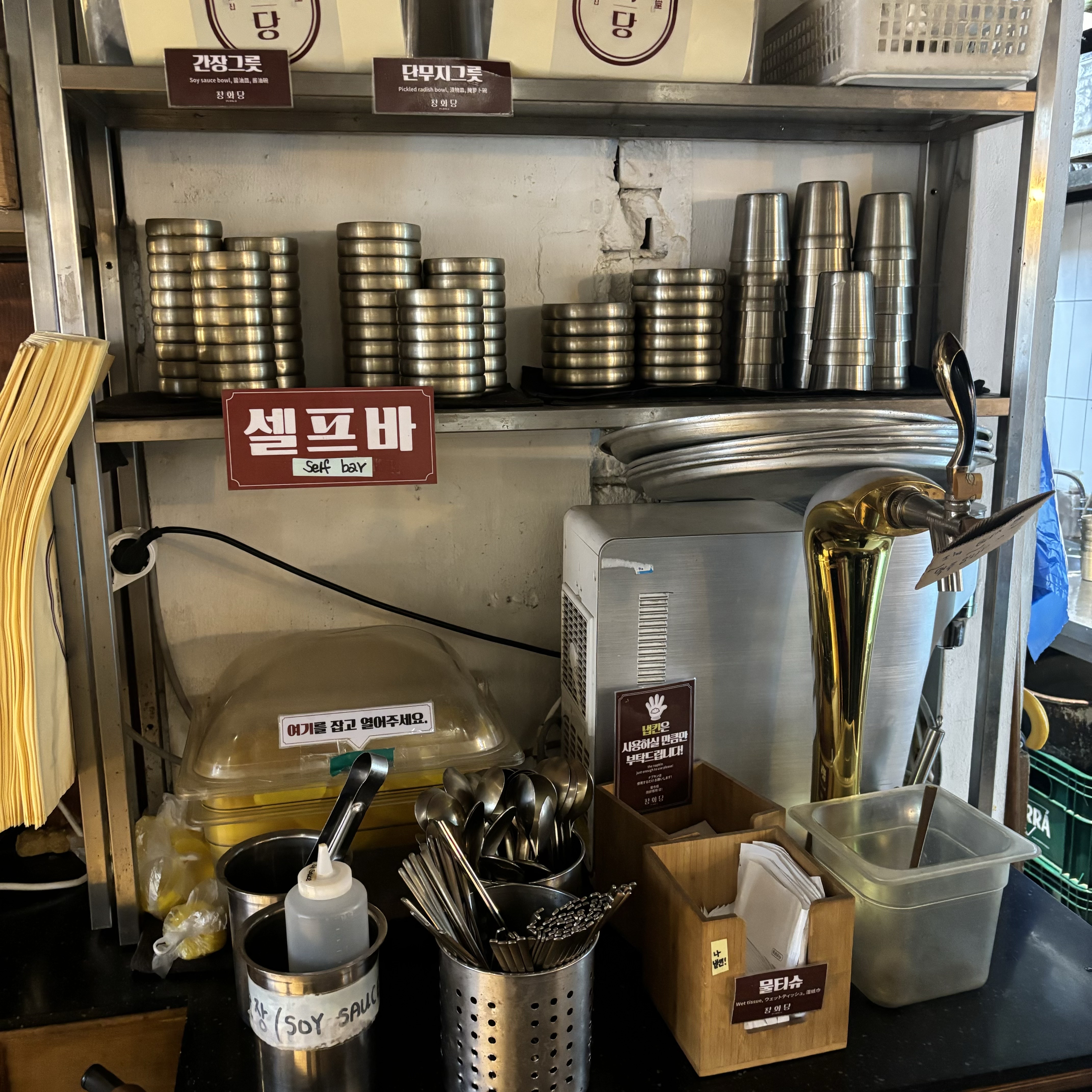 매장의 셀프바에서 수저세트와 물티슈, 냅킨, 반찬들을 이용하실 수 있습니다.