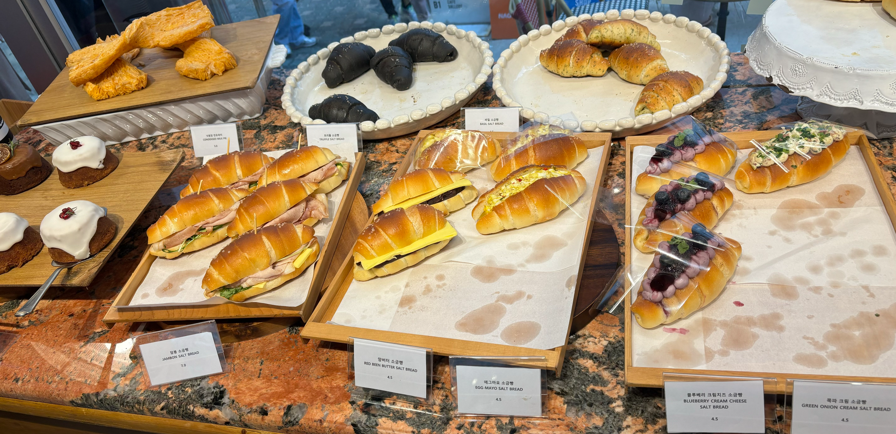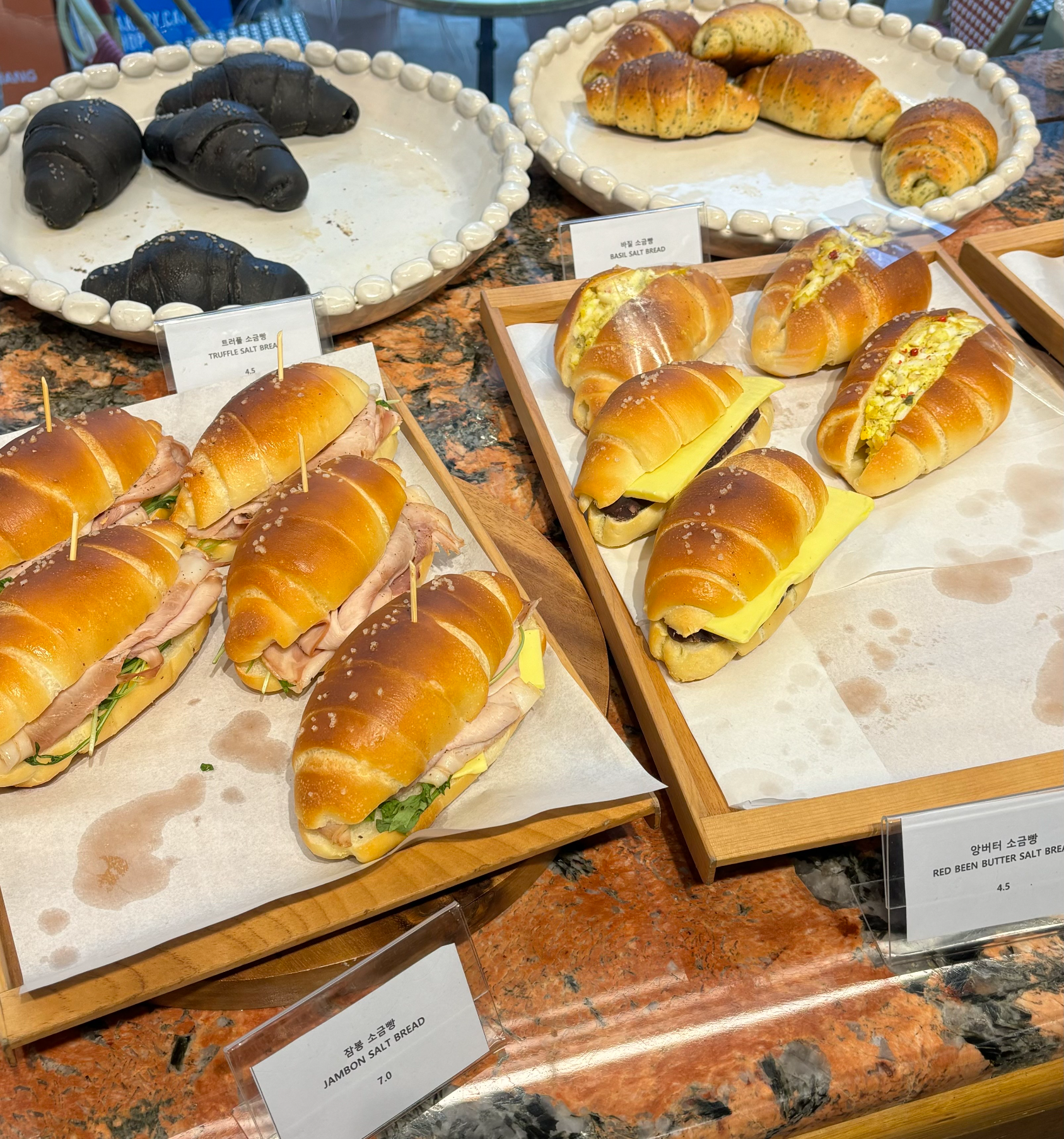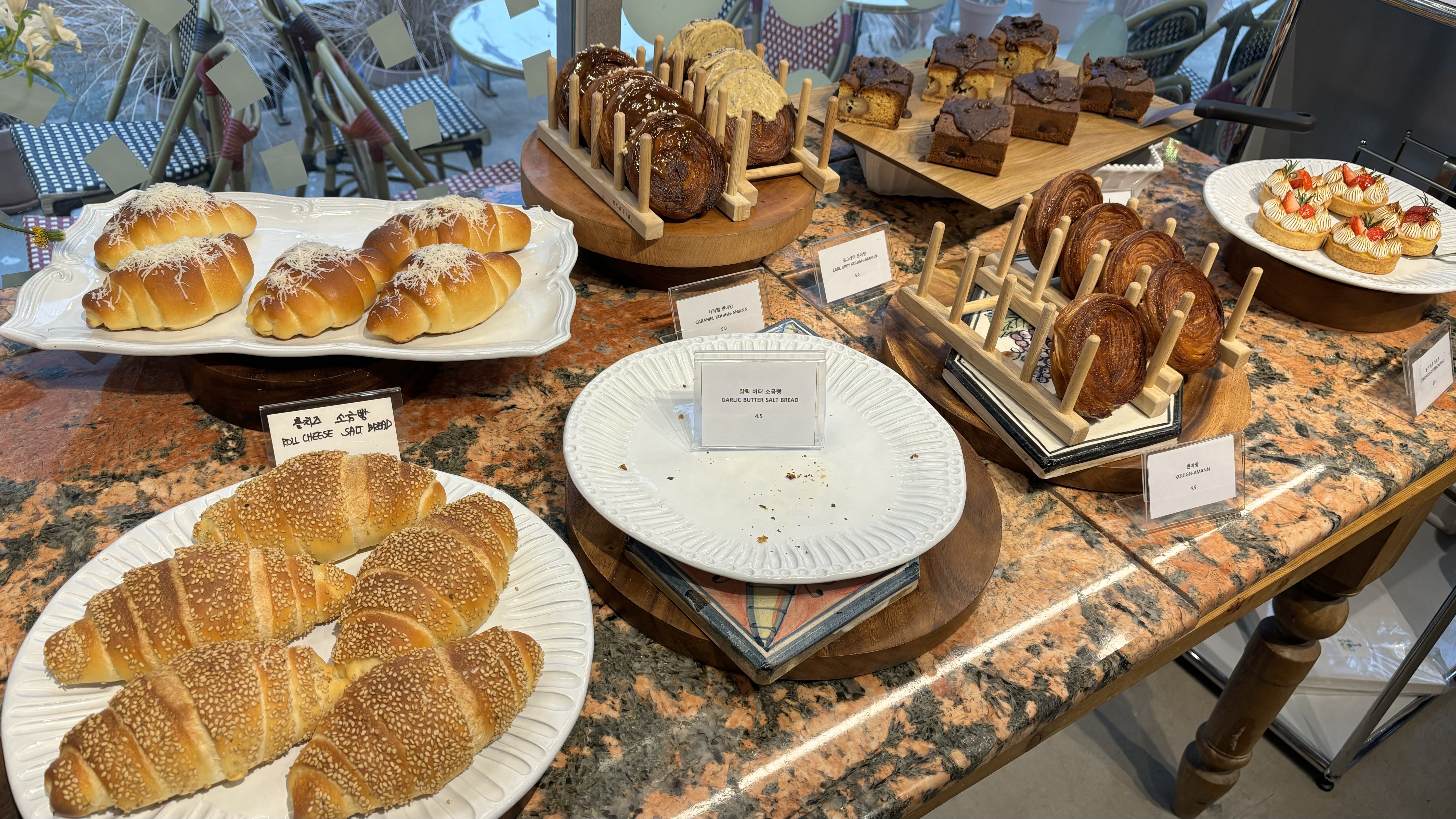 주문을 하기 전에 1층에서 먹고 싶은 베이커리를 먼저 담아줍니다. 베이커리는 종류가 되게 많았고 파이, 파운드, 에그타르트, 소금빵, 케이크 등등 여러 가지의 종류들이 있어서 선택하기 좋았습니다.