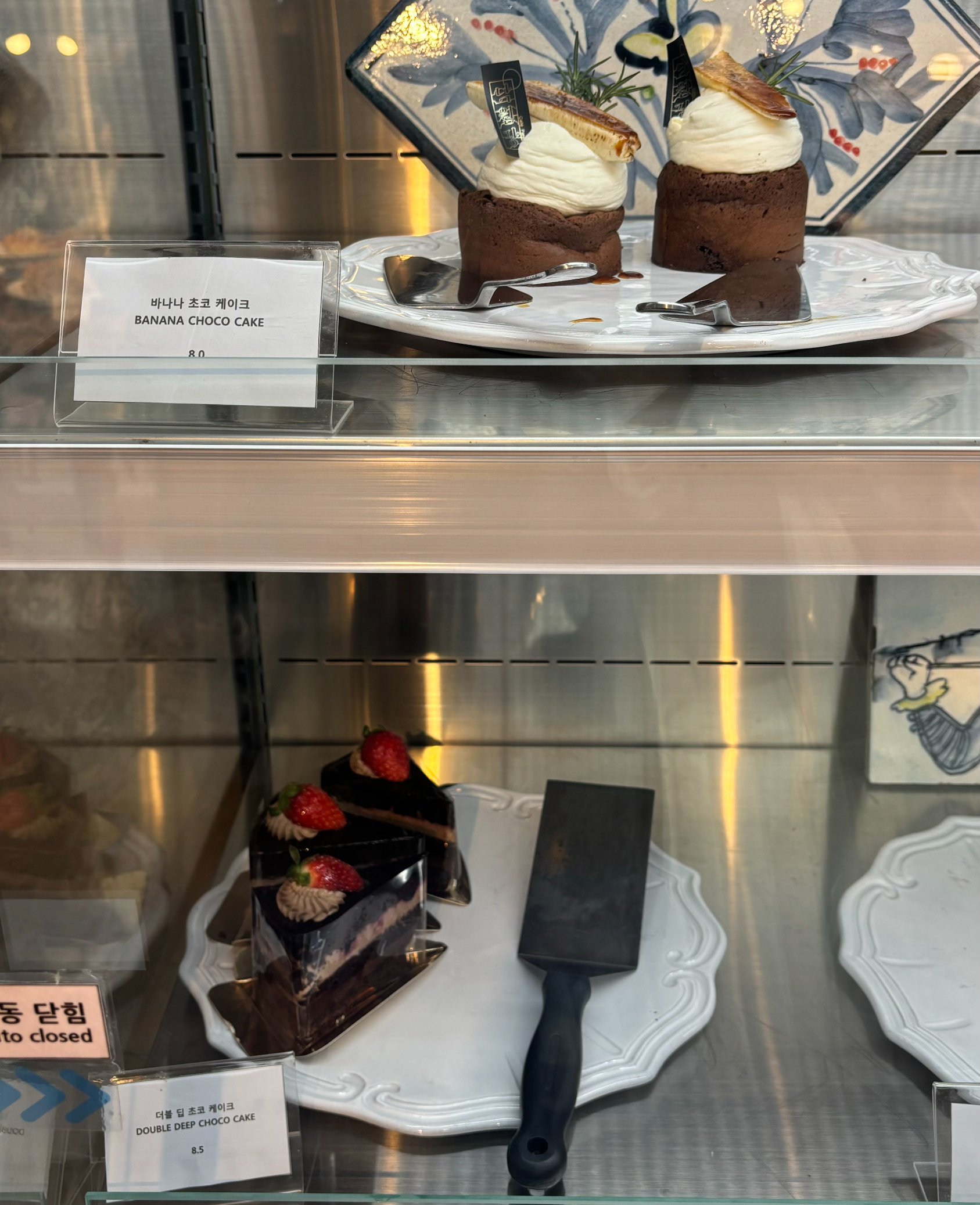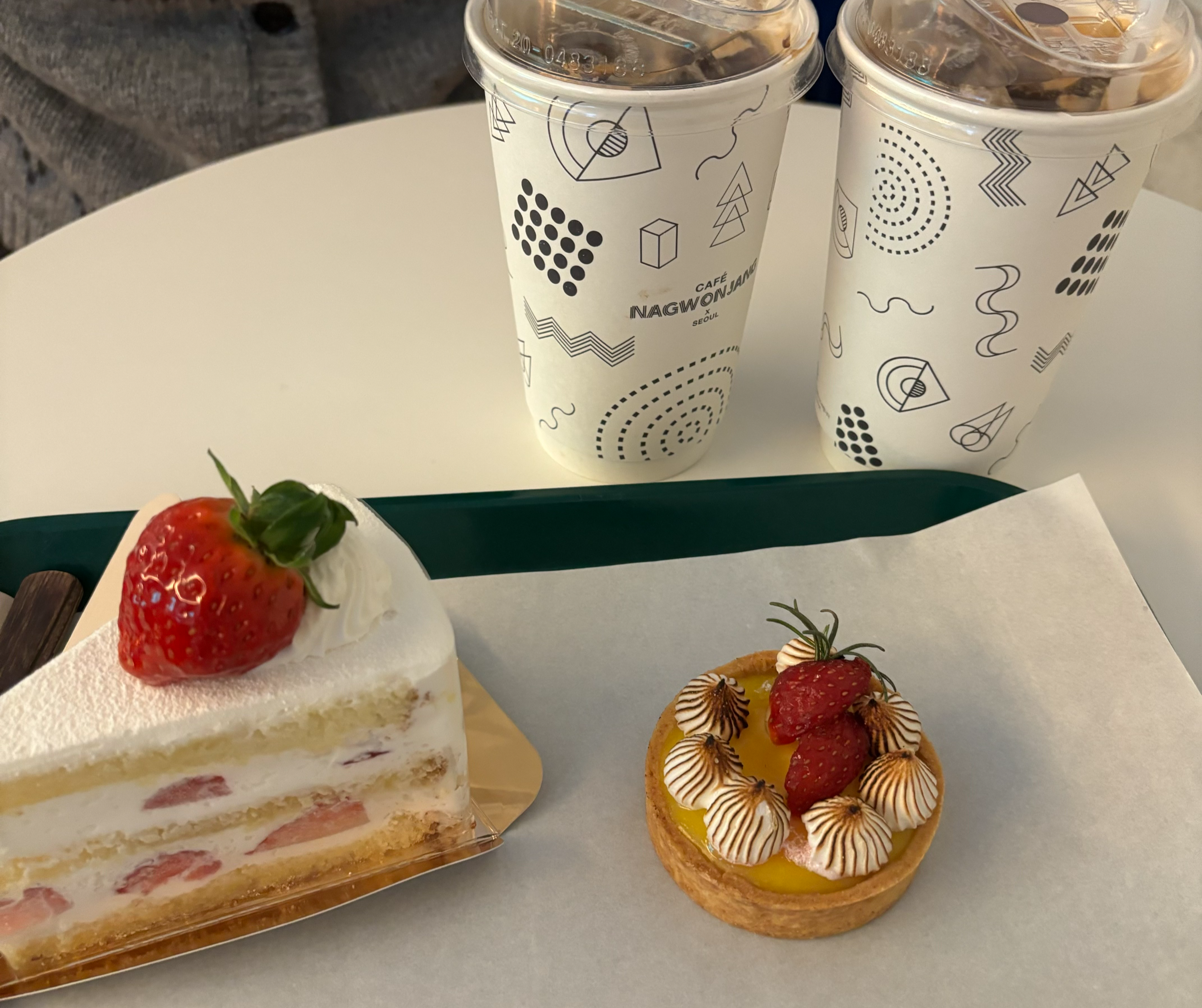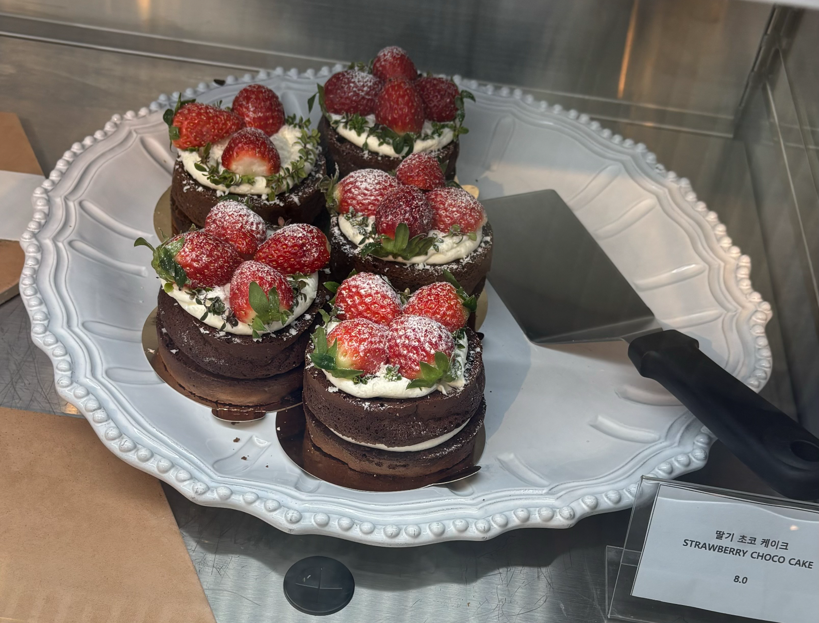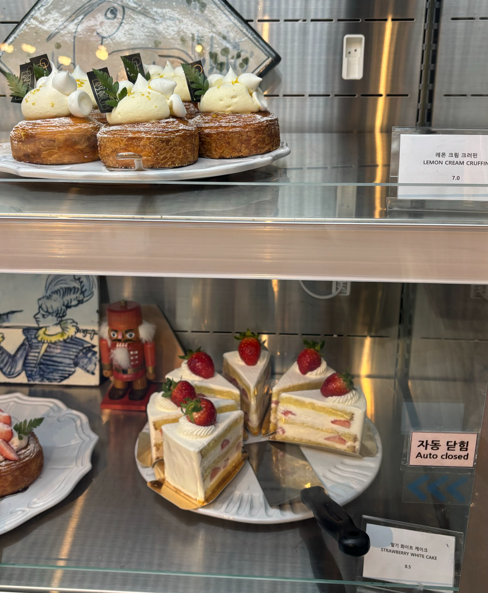 베이커리들이 너무 맛있게 생기지 않았나요? 2층에선 직접 베이커리를 만들고 계셔서 케이크들이 떨어지면 금방금방 채워주셨습니다. 전부 다 먹고 싶었지만 욕심을 버리고 딸기화이트케이크와 에그타르트를 접시에 담았습니다.