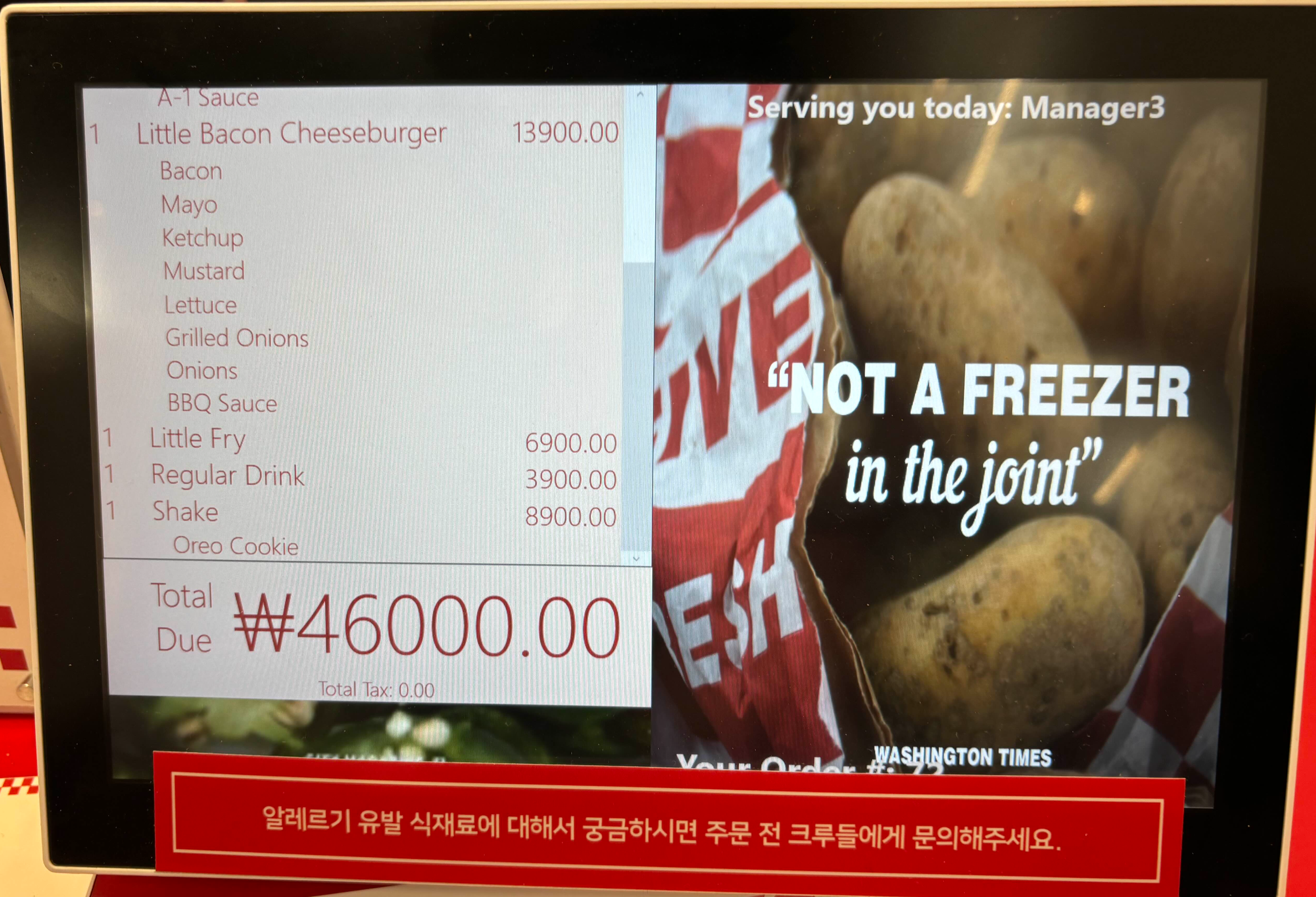 리틀 프라이즈와 탄산음료 1개를 추가로 주문하니. 46,000원이 나왔습니다. 금액이 다른 버거들에 비해 저렴한 편은 아니지만 맛있다고 소문나서 도전해 보았습니다.