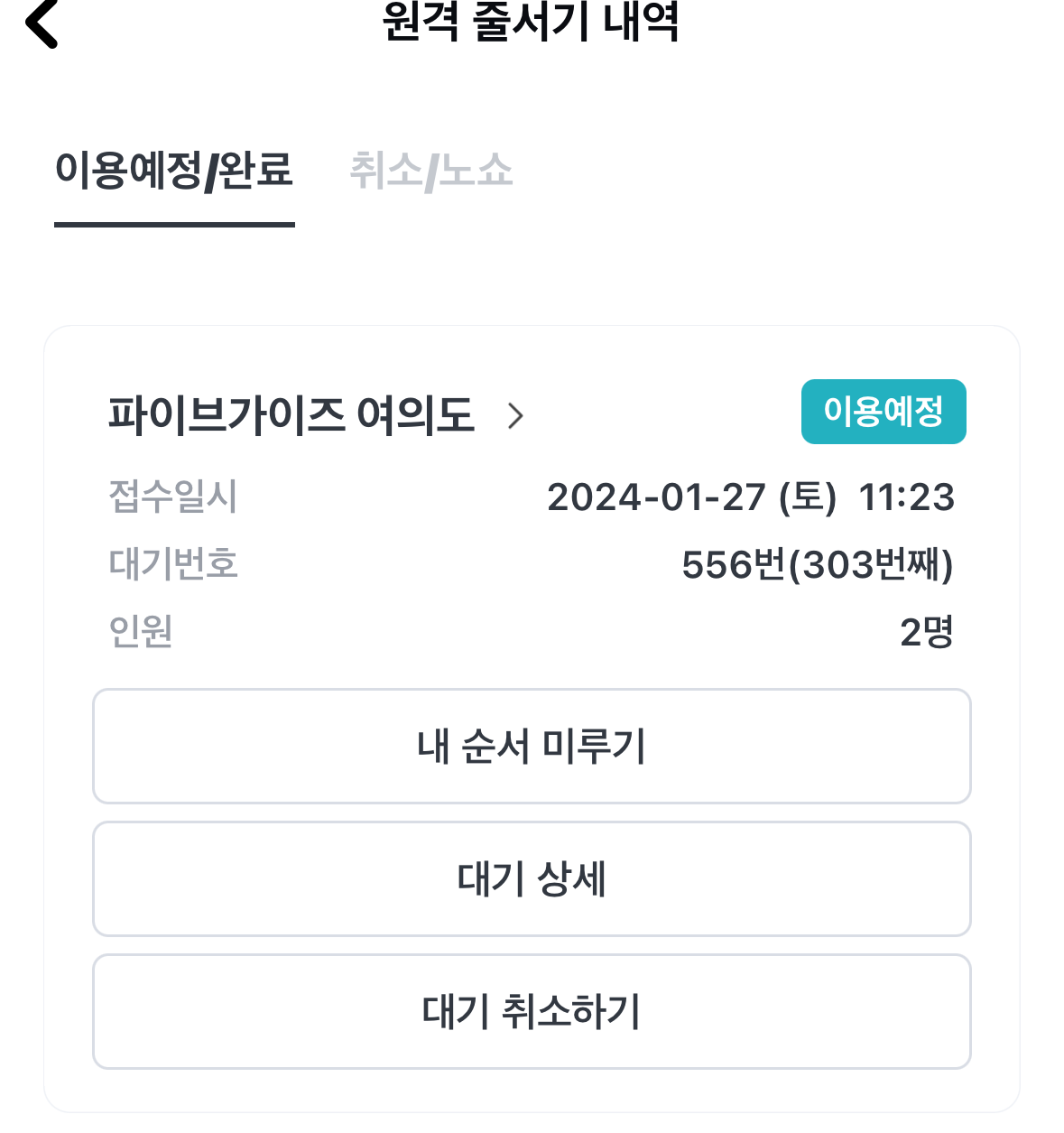 혹시라도 방문하실 때 늦게 도착하실 거 같으면 순서를 미룰 수 있고, 취소도 어플로 가능하시니까 참고해 주세요!