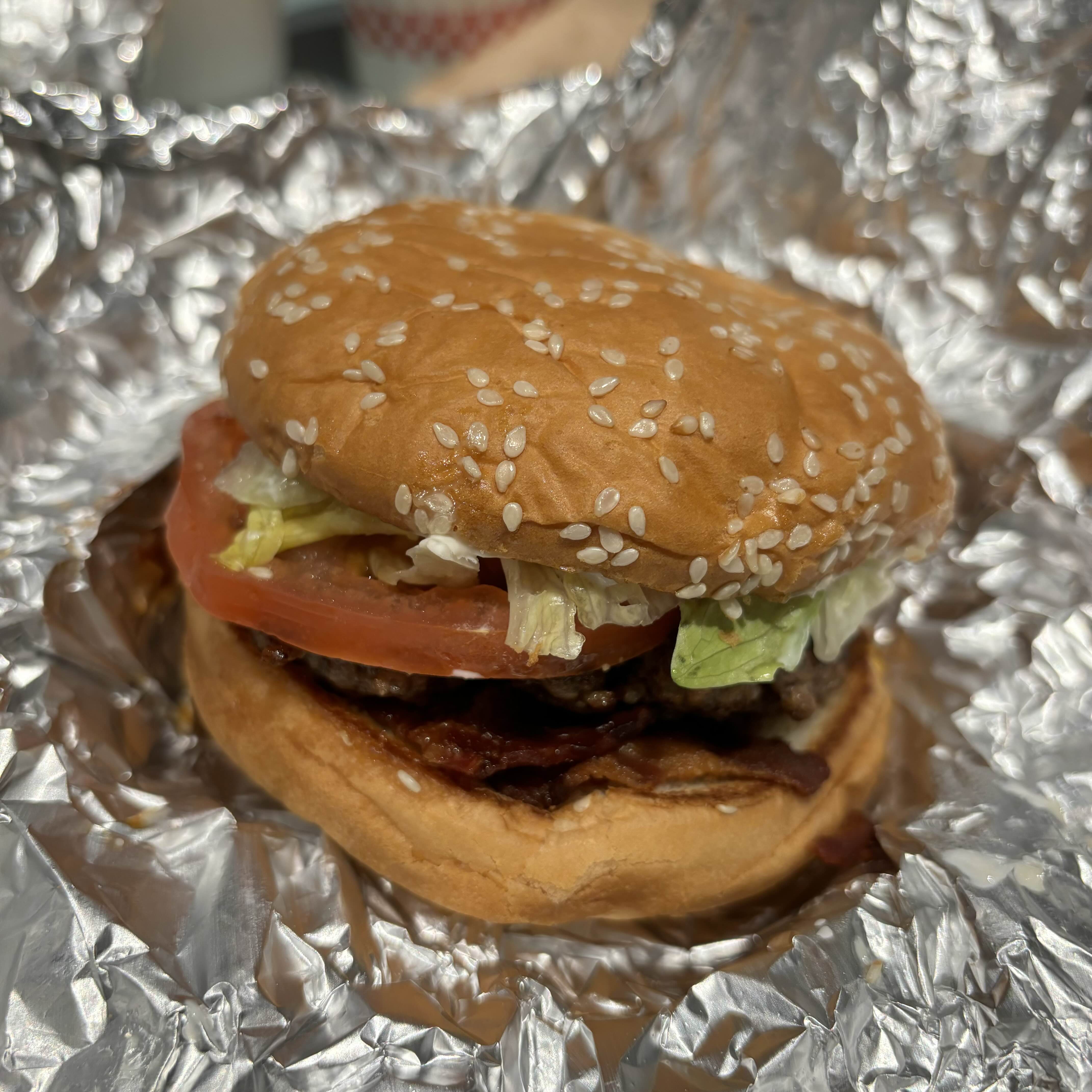 저는 리틀 베이컨 버거에, 토핑은 마요네즈, 케첩, 머스터드, 양상추, 토마토를 넣었고, 스테이크 소스를 추가했습니다.