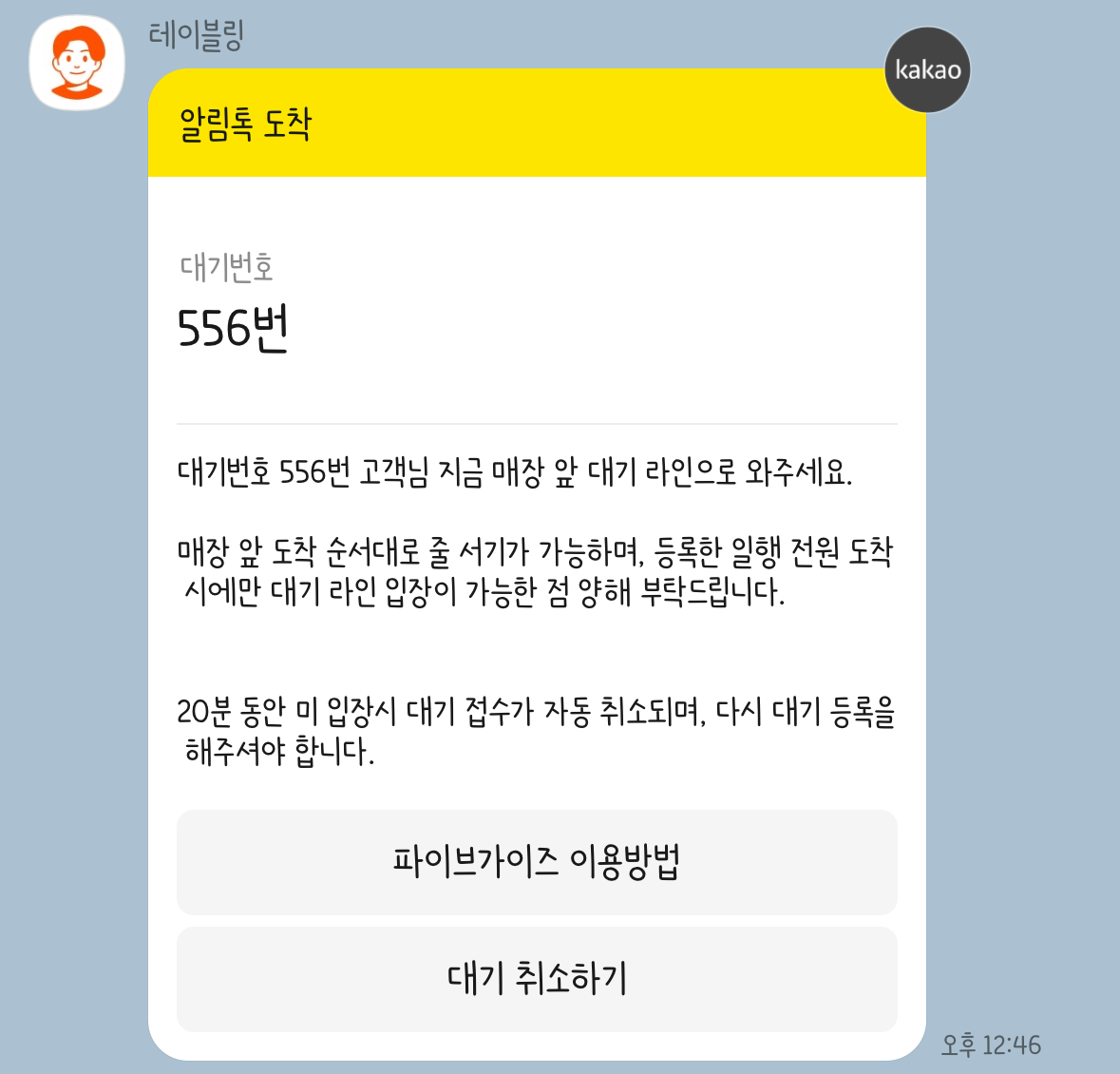 대기를 신청하면 카카오톡으로도 알림이 오고, 순서가 돼도 알림이 오니 확인 주세요~