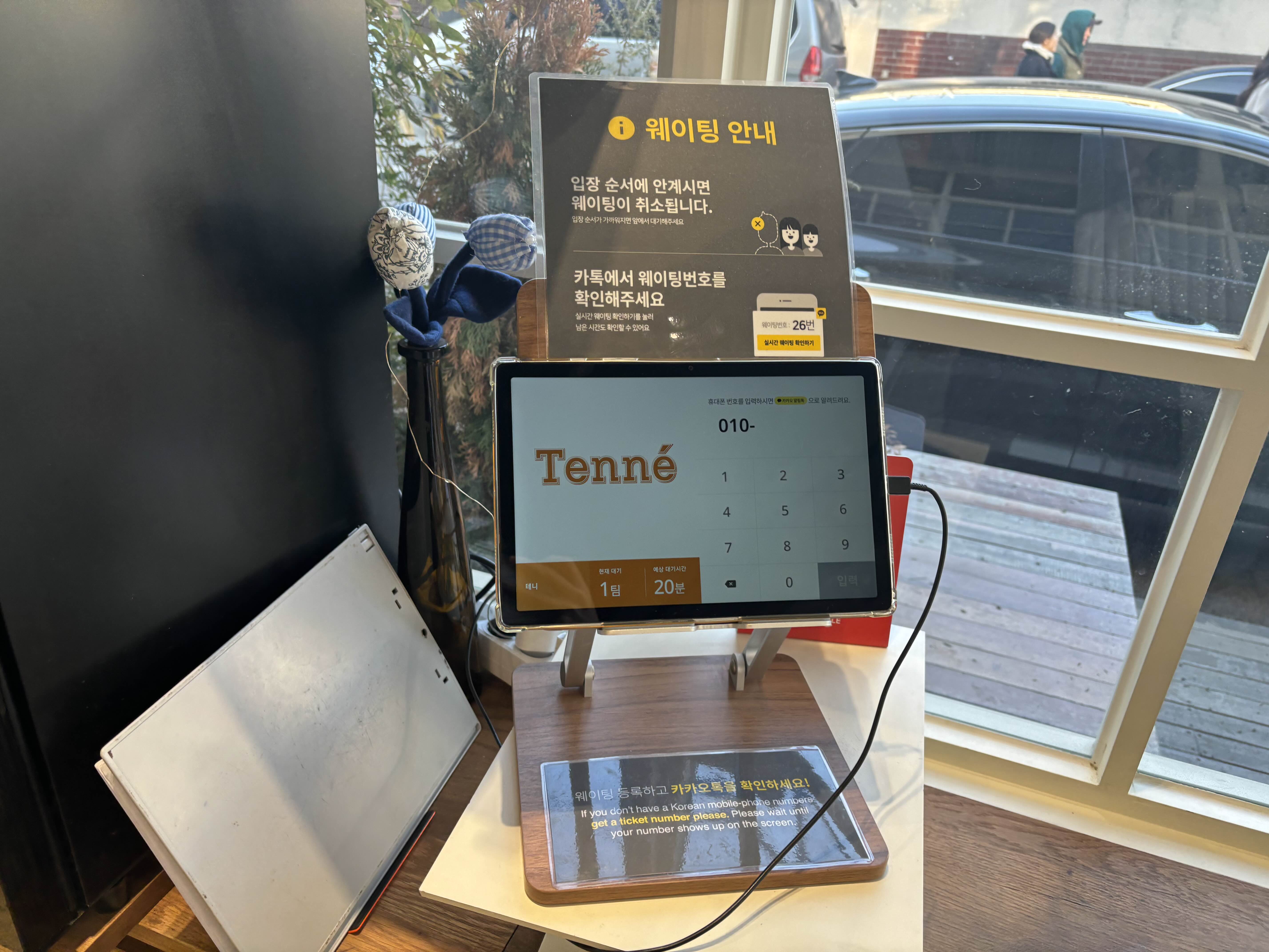 오늘은 성수에 있는 브런치 카페 테니에 방문했습니다. 주말에 방문해서인지 대부분의 카페들이 웨이팅 필수였습니다. 찾아보고 온 카페들이 있었는데, 웨이팅이 어마어마해서 근처 둘러보다가 발견한 카페였습니다. 테니도 마찬가지로 웨이팅이 필요했고, 매장 안에서 웨이팅을 등록할 수 있어서 현장웨이팅하였습니다.
