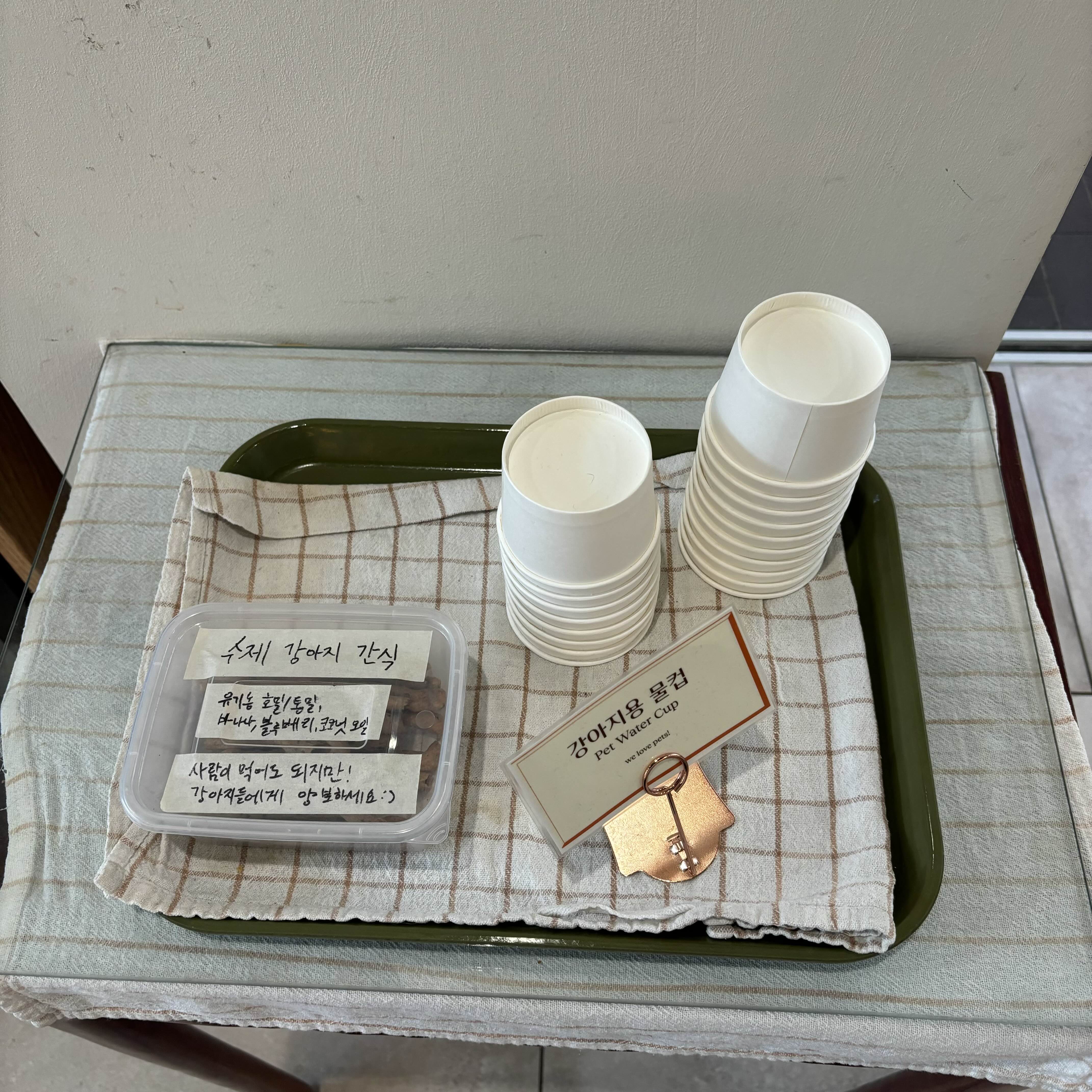 셀프바에는 강아지용 물컵과 강아지 간식이 준비되어 있으니 반려견과 함께 오시는 분들은 강아지 간식도 챙겨주세요!ㅎㅎ 사람이 먹어도 되는 간식이지만 강아지들에게 양보하라고 적혀있습니다. 강아지용 물컵도 아기자기해서 너무 귀엽습니다.