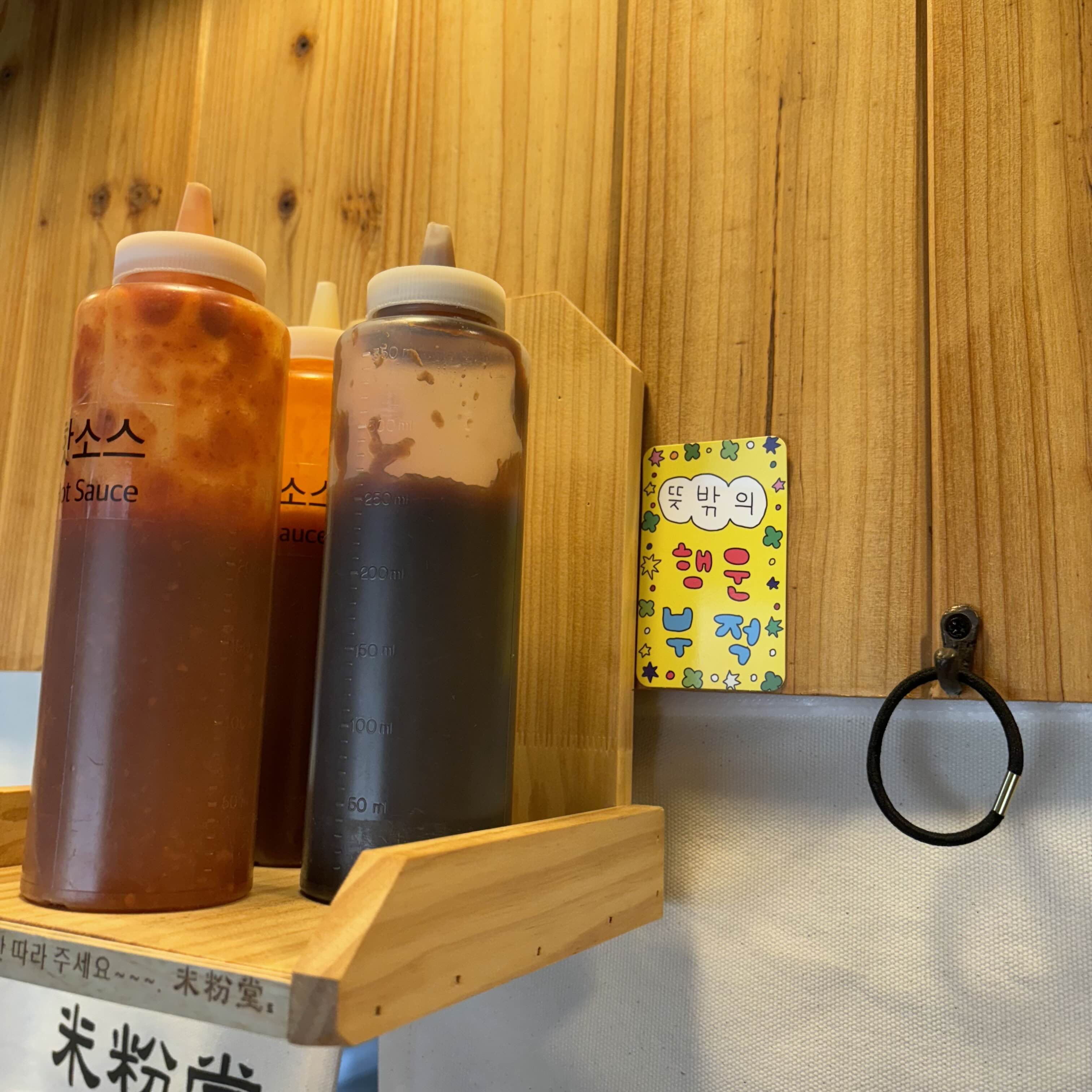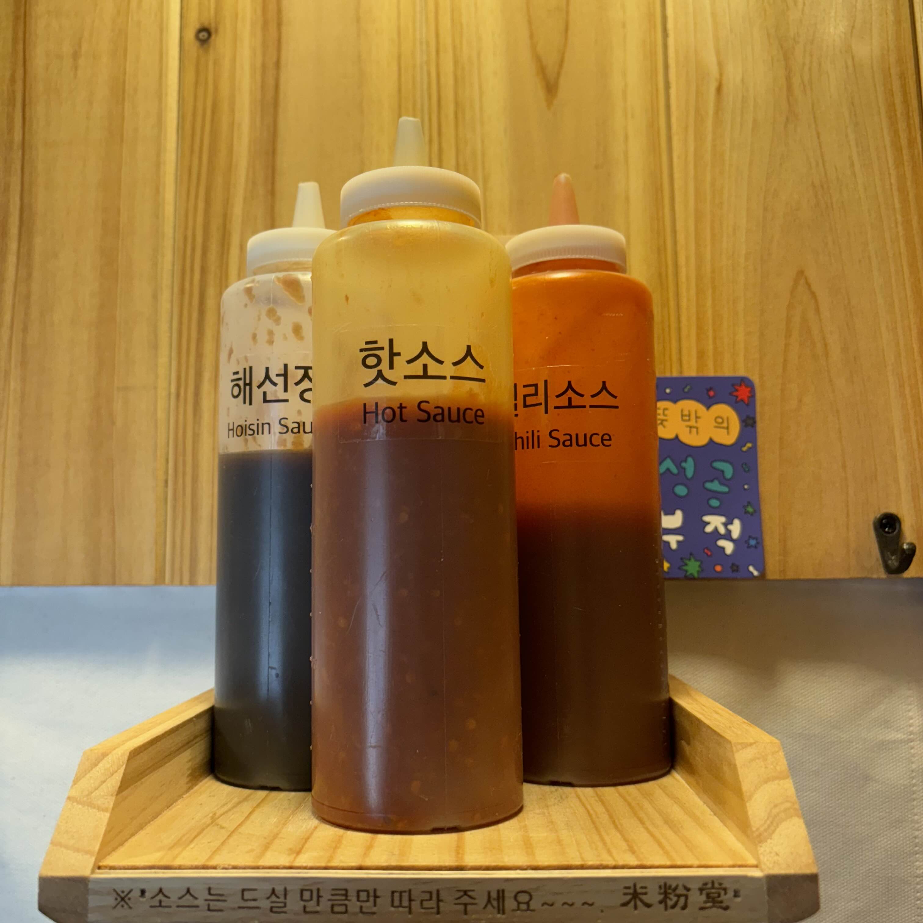 매장에 들어가서 편한 자리에 앉으시면 됩니다. 선반 위쪽에는 해선장소스, 핫소스, 칠리소스가 준비되었으니 취향에 맞게 덜어서 드시면 됩니다.