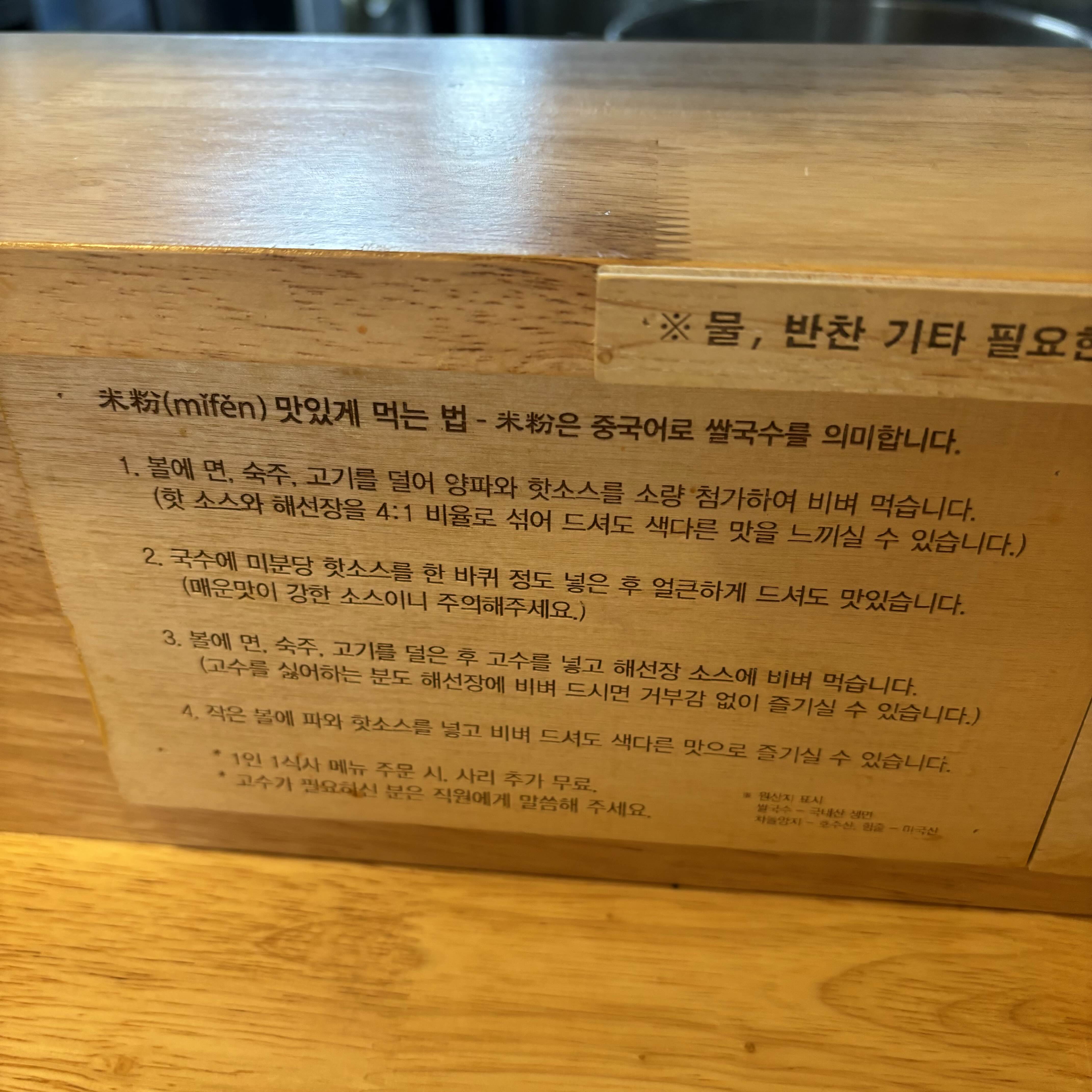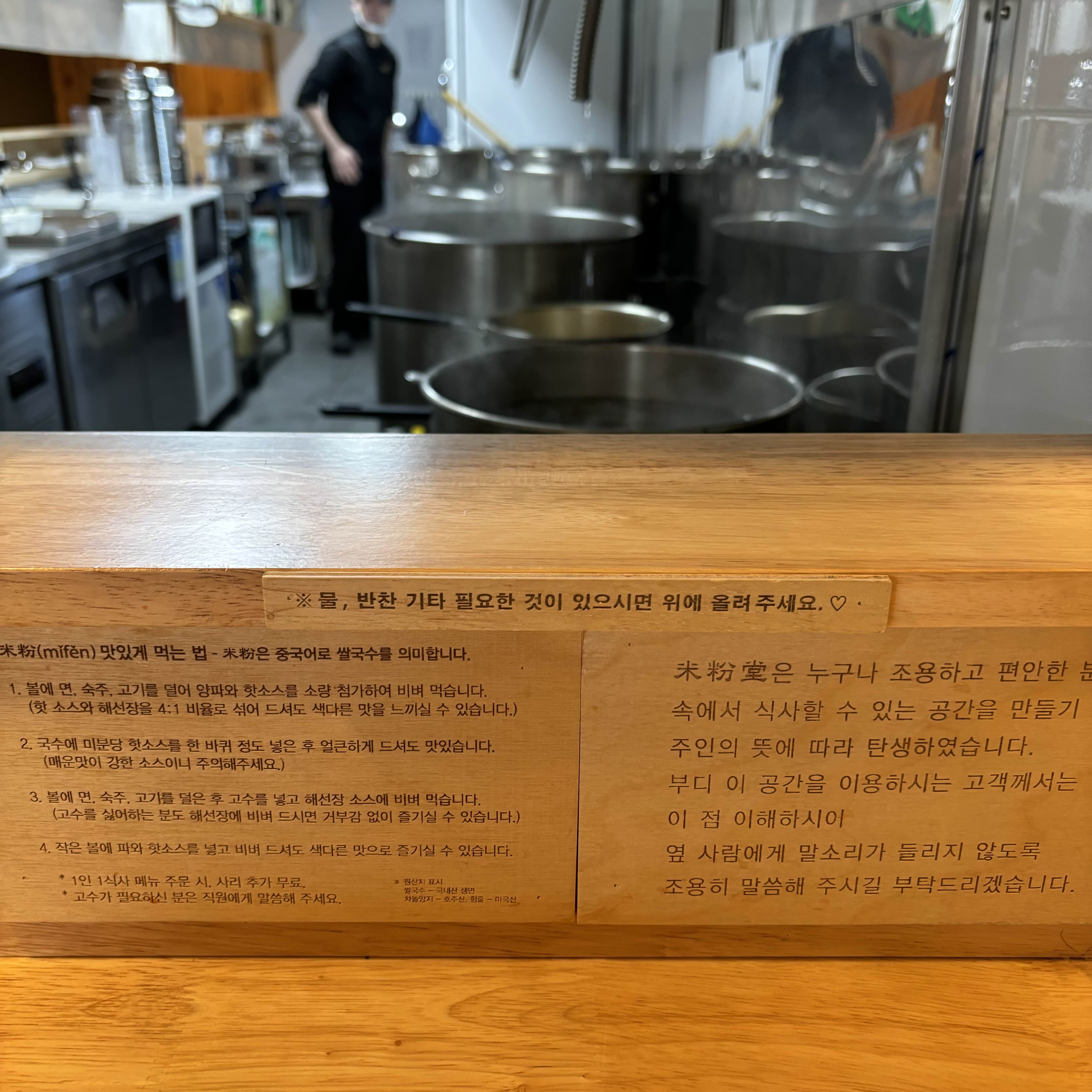 미분당은 중국어로 '쌀국수'를 의미한다고 합니다. 누구나 조용하고 편안한 분위기 속에서 식사할 수 있는 공간을 만들기 위해 주인의 뜻에 따라 탄생되었다고 합니다. 그래서 그런지 매장에서는 조용한 분위기로 식사를 해야 했고, 옆사람에게 말소리가 들리지 않도록 조용히 대화하며 식사를 해야 했습니다. 혼자 식사하러 오시는 분도 많았고 매장이 조용해서 편안한 분위기 속에서 식사할 수 있었습니다. 또한 물이나 반찬, 기타 필요한 것이 있으면 위쪽에 올려주시면 직원분이 알아서 가져다주시고 물도 새로 떠다 주시니 참고해 주세요!