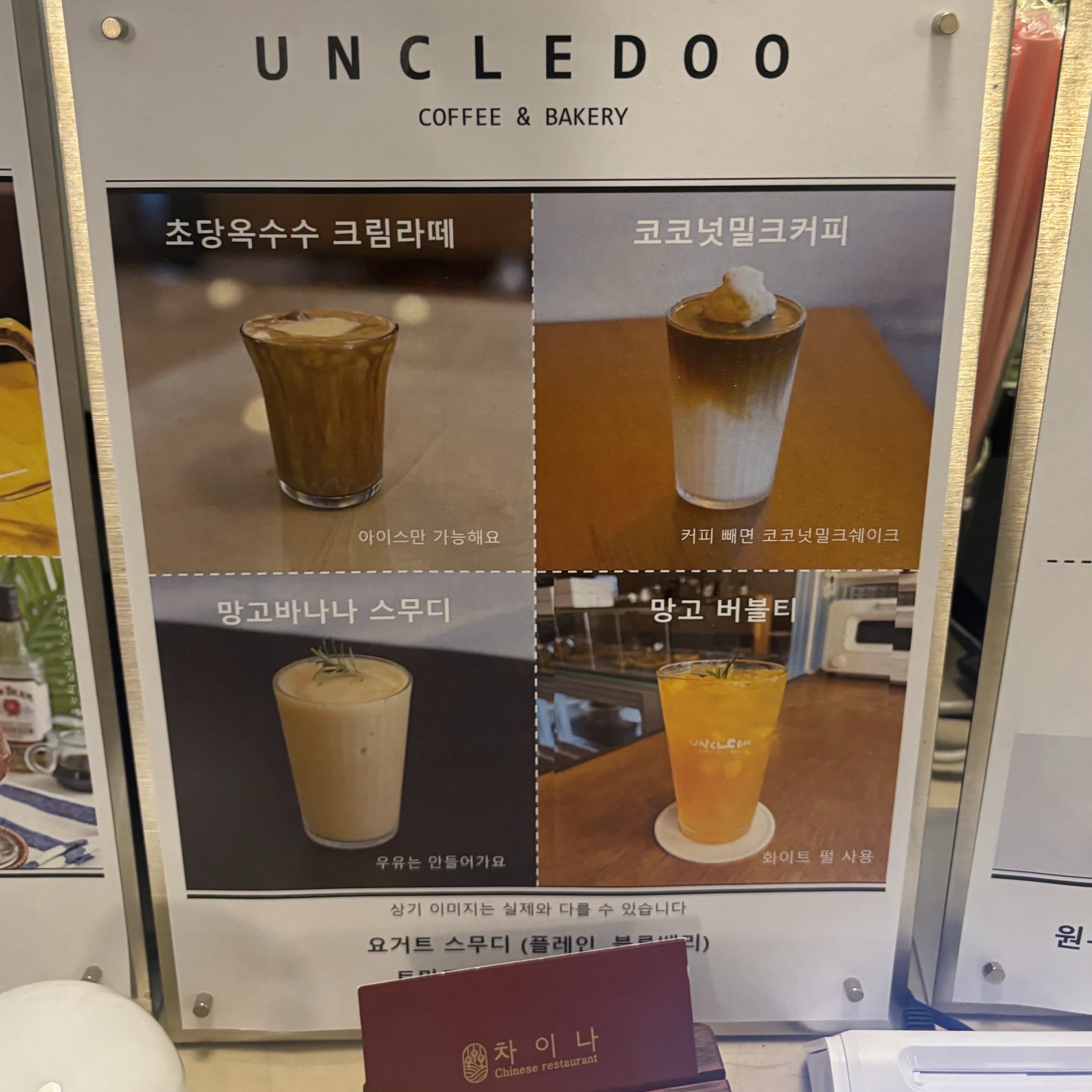 초당옥수수 크림라테, 코코넛밀크커피, 망고바나나 스무디, 망고 버블티도 맛있어 보이더라고요 다음번엔 사진 중에 하나 선택해서 먹어봐야겠어요ㅎㅎㅎㅎ
