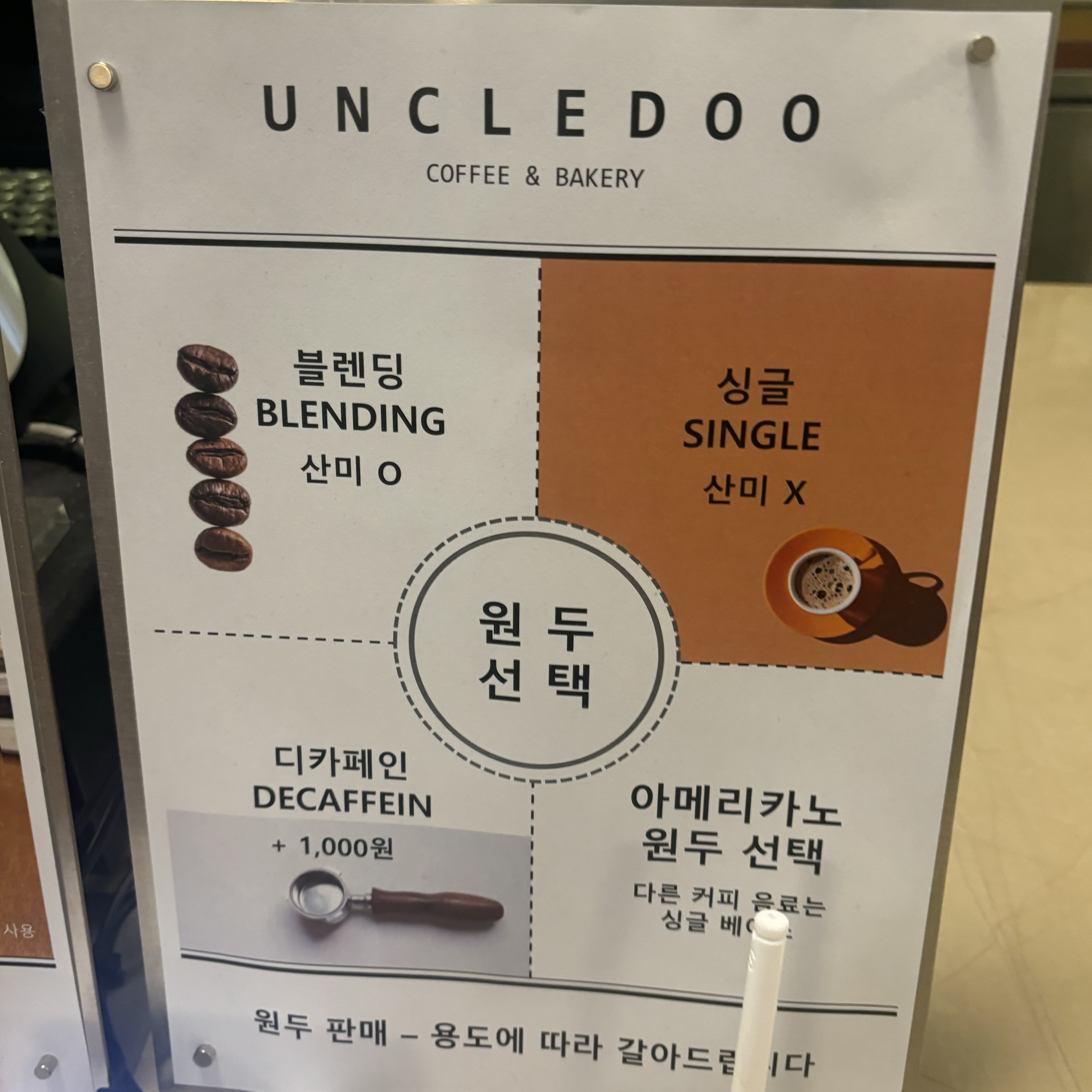 아메리카노는 원두를 선택해야 하고 산미 없는 것과 산미 있는 것을 선택해 주면 됩니다~