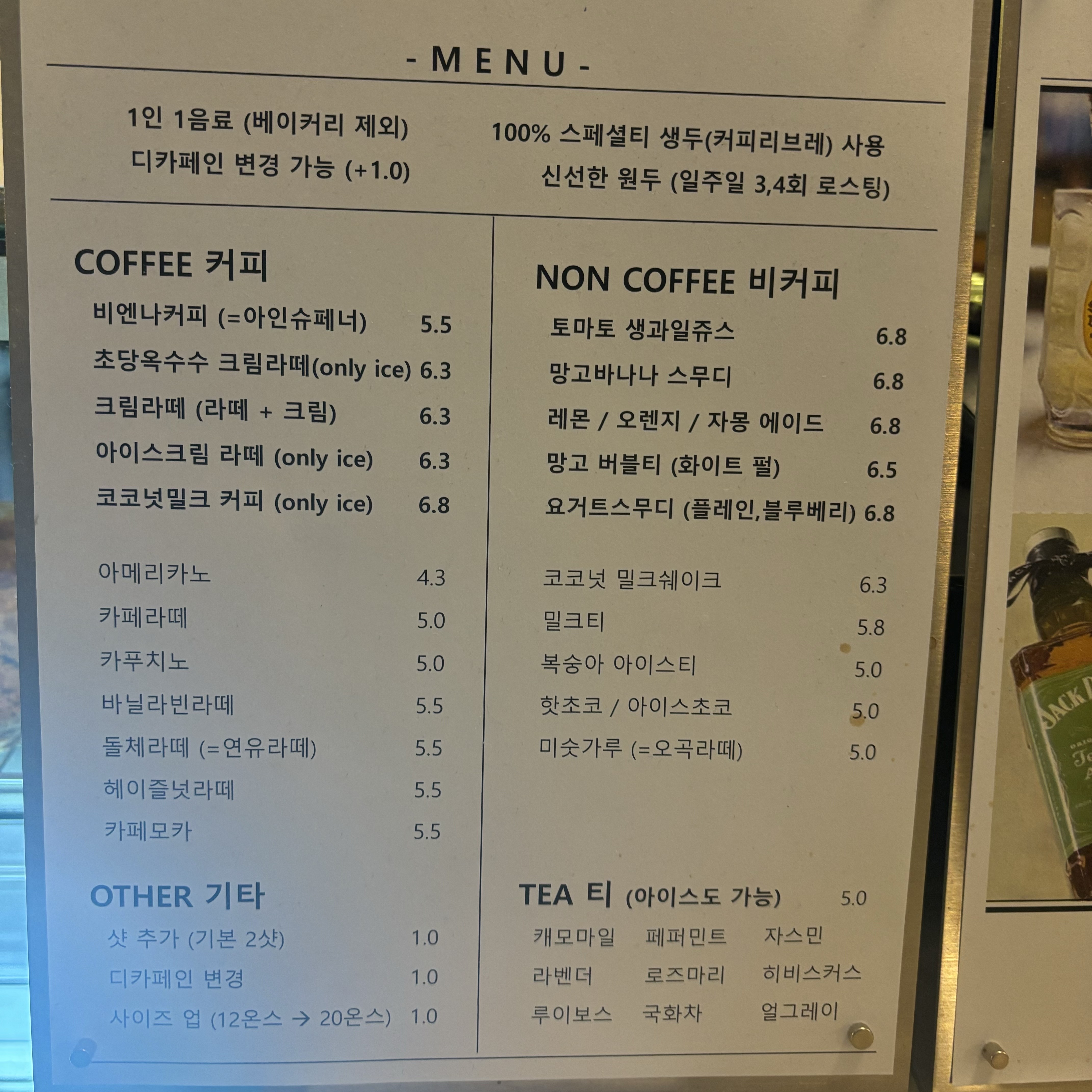 메뉴는 이렇게 있습니다! 친구들과 여행계획 세우려고 만났고 아이스아메리카노 두 잔, 아이스 밀크티 한잔 총세잔 구매했습니다~
