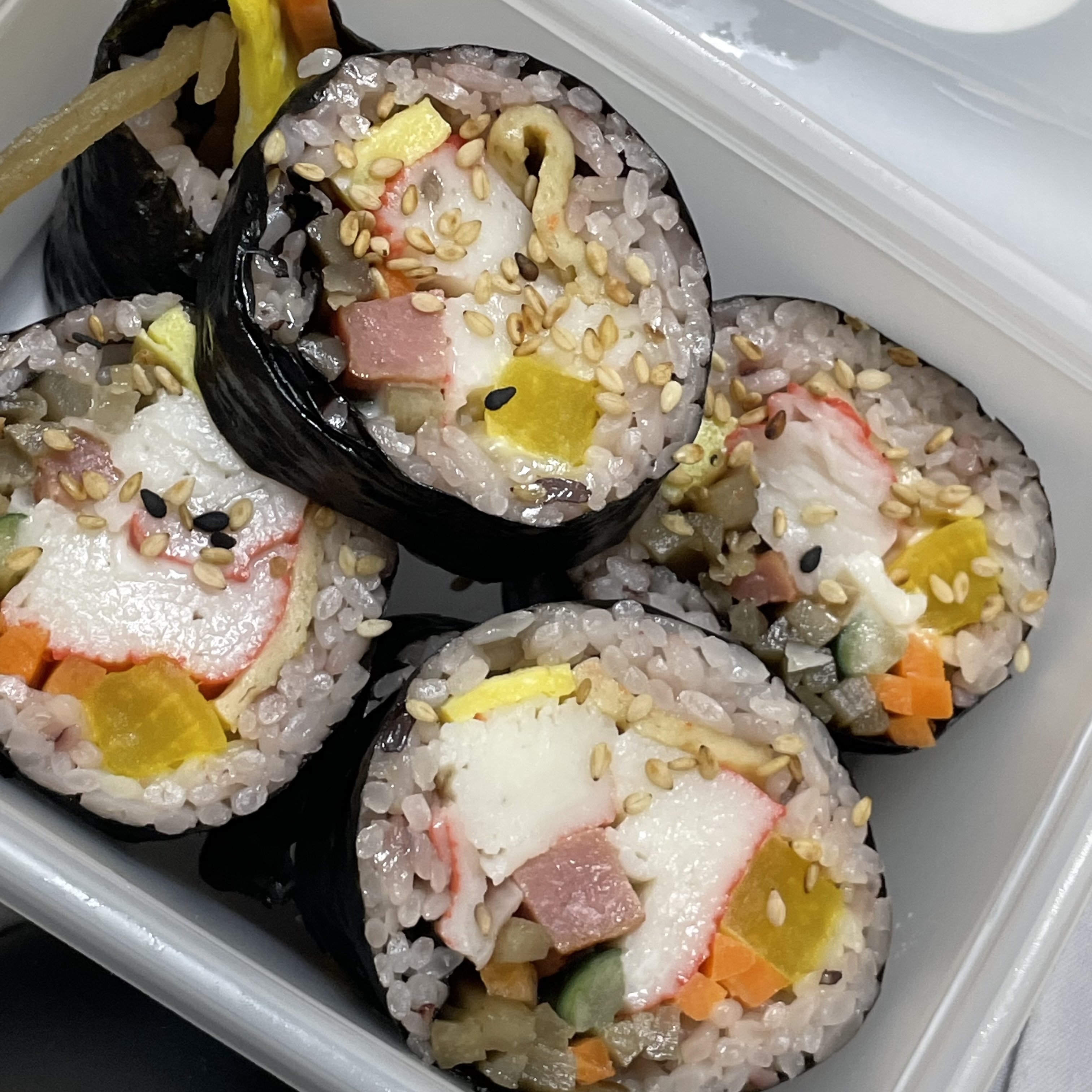김, 단무지, 어묵, 햄, 우엉, 맛살, 오이, 당근, 계란, 참기름, 통깨, 소금